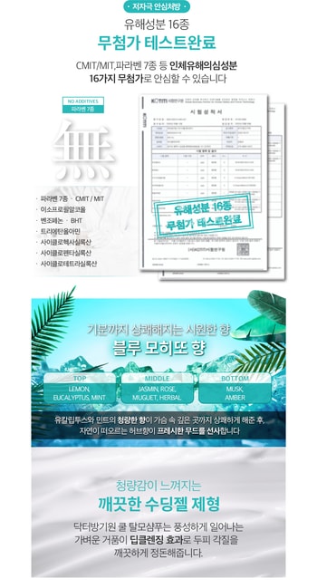 정제수, 소듐라우레스설페이트, 암모늄라우릴설페이트, 코카미도프로필베타인, 멘톨, 코카마이드엠이에이, 소듐클로라이드, 소듐벤조에이트, 구아하이드록시프로필트라이모늄클로라이드, 살리실릭애씨드, 판테놀, 캠퍼, 라우릴알코올, 암모늄설페이트, 다이소듐이디티에이, 폴리쿼터늄-7, 코코넛애씨드, 부틸렌글라이콜, 지황뿌리추출물, 검은깨추출물, 산수유열매추출물, 질경이택사덩이줄기추출물, 참마뿌리추출물, 중국토복령추출물, 모란뿌리추출물, 흑미추출물, 검은뽕나무열매추출물, 포도추출물, 가시오갈피뿌리추출물, 자두추출물, 복분자딸기열매추출물, 하이드롤라이즈드콜라겐, 하이드롤라이즈드콩단백질, 1,2-헥산다이올, 라벤더오일, 레몬밤잎오일, 로즈마리잎오일, 유칼립투스잎오일, 커먼자스민오일, 티트리잎오일, 페퍼민트오일, 해바라기씨오일, 하이드롤라이즈드케라틴, 바닐라콩추출물, 캐롭열매추출물, 검정콩추출물, 콩추출물, 로우스위트블루베리추출물, 올리브추출물, 펜틸렌글라이콜, 에틸헥실글리세린, 코카마이드디이에이, 페녹시에탄올, 미리스틸알코올, 향료, 시트랄, 리모넨, 리날룰![]() ![]() ![]() ![]() ![]() ![]() ![]() 0.0