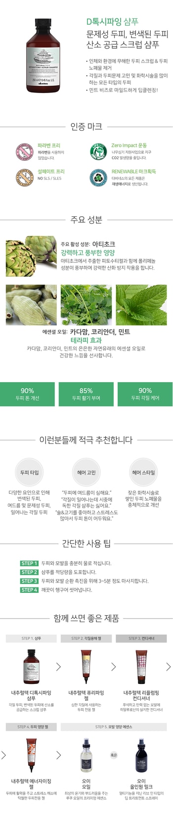 두피와 모발을 충분히 물로 적시고 적정량을 도포하여 3-5분 마사지 후 깨끗이 헹굼포함성분