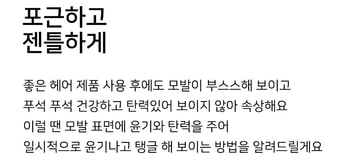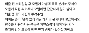 샴푸 후 젖은 모발에 분사해도 괜찮습니다. 스타일링 후 모발 끝에 분사하여 정돈해 줍니다. 건조할때 2-3회 분사 후 모발을 정돈해 줍니다.포함성분