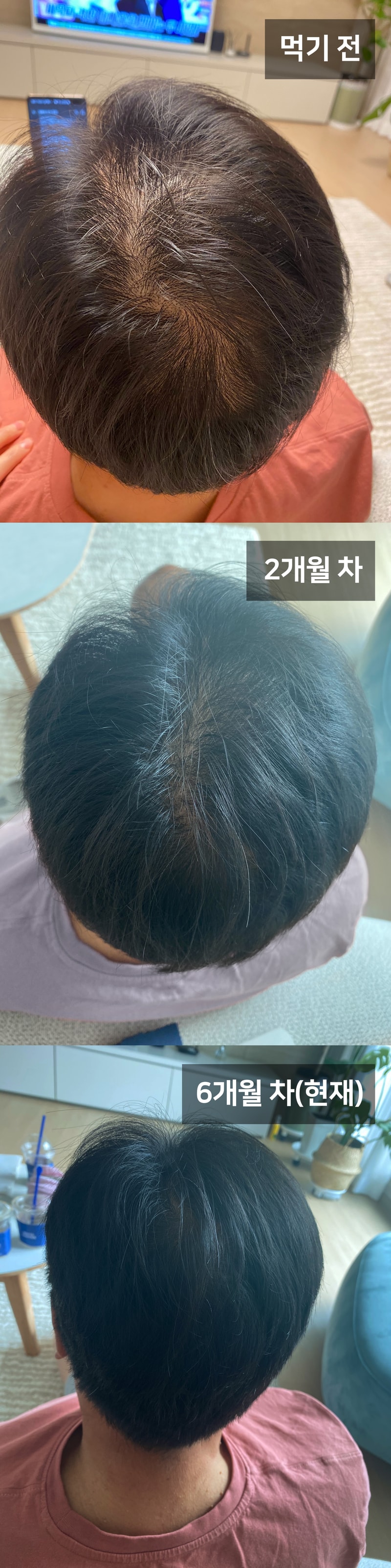 특히 정수리 부분이 많이 달라졌는데, 이전에는 사진을 찍으면 정수리 가운데가 하얗게 보였던 부분이 이제는 잔머리가 많이 올라오고 머리도 굵어져서 그런지 비어있는 영역이 많이 채워진걸 느꼈습니다.
