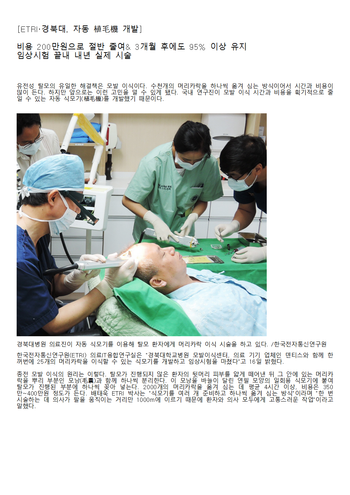 하하 저도 드디어 모발이식까지 받았네요.제가 정수리가 심각하게 털린 상태였습니다.가발 쓴지는 좀 됐는데요. 쓰고 생활해서 그런지 더 악화된 상태였습니다.다들 아시다시피 불편한건 둘째치고 문제는 앞쪽까지 점점 탈모가 번지고 있었습니다.정수리 때문에 비싼 돈주고 가발 맞춘건데 그마저 있던 앞머리까지 영향을 받으니이거 환장할 노릇이더라구요. 그래서 다급하게 수술을 결심한 계기도 있습니다.전 아직 40대 입니다. 애들 친구 아빠를 봐도 저처럼 털린 사람은 못봤습니다.정수리랑 털리기 시작한 앞쪽까지 해서 4000모 시원하게 완전 삭발로비절개 이식 받고 왔습니다.수술시간은 5시간 준비하고 뭐라고 6시간 정도는 걸린거 같습니다.우선은 마취과 전문의가 있는 곳이라 수면마취 엄청 꼼꼼하게 체크해주셨고뭔가 위생이나 시스템이 대학병원 온것과 같은 느낌을 받았습니다.기억나는 수술 과정은삭발 – 마취 – 채취 – 휴식 – 마취 – 이식 이렇게 진행했고간호사분과 의사분이 안내하는대로 따르기만 하면 되는거라 제가 어려운건 없었습니다.잠깐의 수면마취 이후에 진행한터라 잠깐 눈감았다가 일어나면 아픈게 모두 끝나있었습니다.덕분에 너무 편하고 안전하게 받았고 몰랐는데 수술실 들어가니 원장님 말고 간호사분들도 굉장히 많으셔서 놀랐습니다. 다들 친절하시고 전문적인 것 같았습니다.비절개해서 그런지 생각보다 아픈거 없고 생활하는데 지장은 없지만날씨도 춥고 모자쓰기는 부담스러워 며칠 휴가내고 집에서 푹 쉬는 중입니다.살짝 가려운데요 긁지 못하는건 고생이네요.이 잠깐의 고생만 거치면 풍성한 모발을 가질 수 있다라는 기대 해봅니다.수술직후 사진 받아서 확대해서 보는데 정말 꼼꼼하고 밀도 좋게 심어진거 같고의사도 아무나 하는게 아니구나 새삼 느꼈네요.삭발하고 이식 받으면 머리 자라면서 전체적으로 같이 풍성해 지겠죠?머리 잘 자라서 졸업하고 싶습니다.후기 봐주셔서 감사합니다.