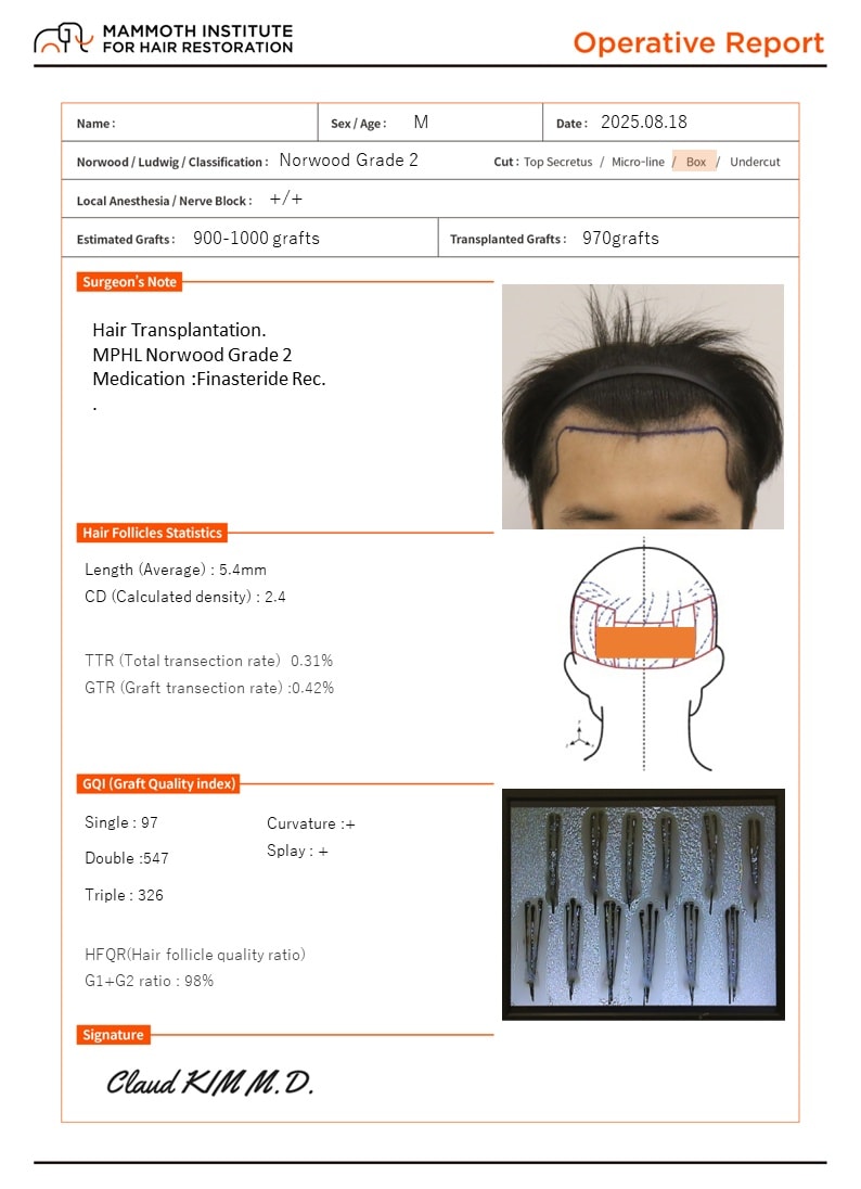 부산 맘모스에서 비절개, BOX-CUT 방식으로 970모낭 이식했습니다.