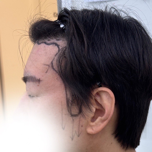원래 저는 옆머리 앞쪽을 길러서 구라나룻을 만들고 다녔다 했었죠? 근데 얘가 수술 직전에 일부 날아갑니다. 왜냐하면 기존 머리가 나는 부분과 이식할 부분의 경계를 확실히 하기 위해 경계선 부분을 살짝 면도하고 수술에 들어가거든요.