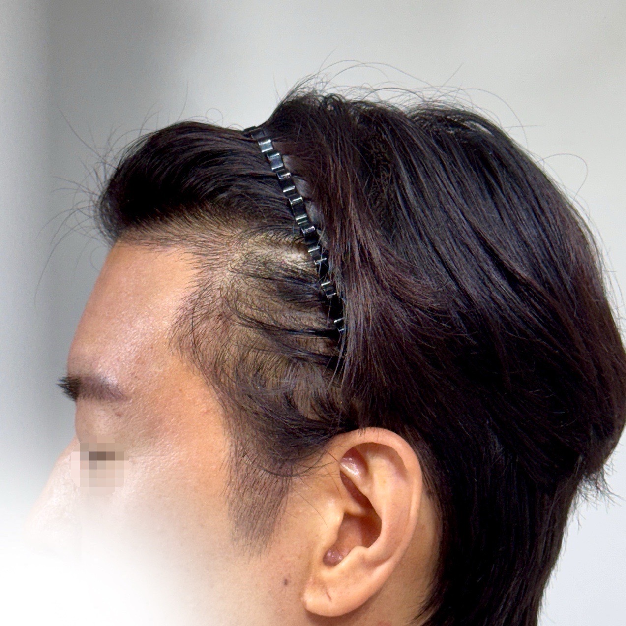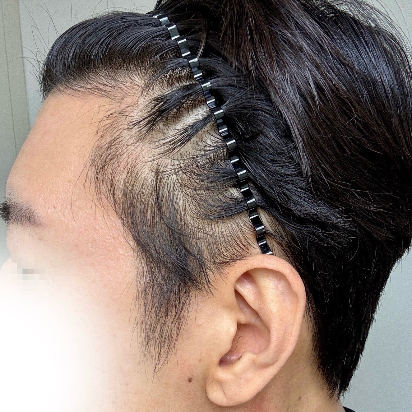 또한 옆머리 라인은 결국 관자놀이와 구렛나루의 합이니 구렛나루에 맞게 관자놀이 부분도 각 있게 잡아 주셨습니다. 살짝 들어간 M자 부분도 채워주는 것으로 되었고요. 이 관자놀이부도 제가 선천적으로 좀 부족한 면이 있어서 이 쪽에 모수가 꽤 필요하더라고요.