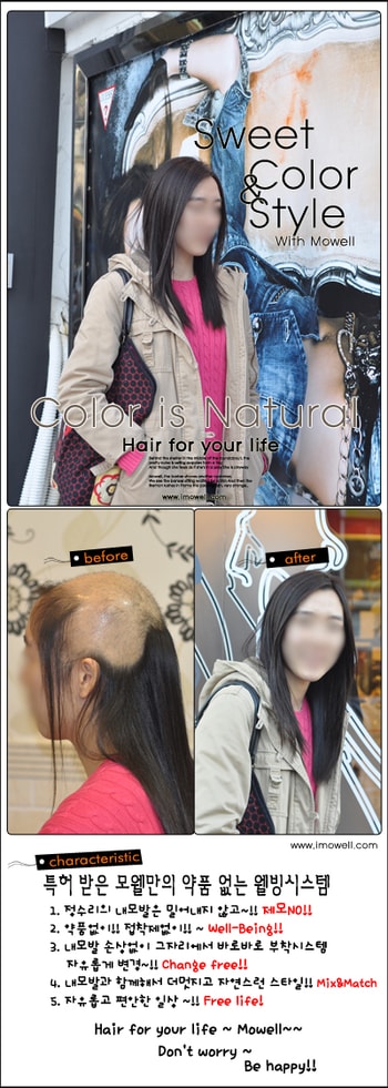 여성이나 남성이나 본인의 머리를 밀어내지 않고 약품없이 착용하는 편안하고 스타일 있는 모웰입니다.