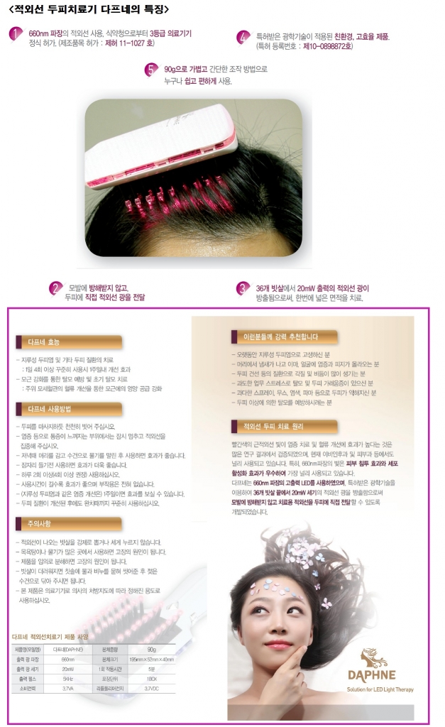 이번에 저희 회사에서 신개념의 적외선 두피/탈모 치료기 "다프네"를 개발하였습니다.