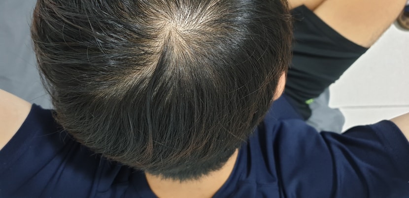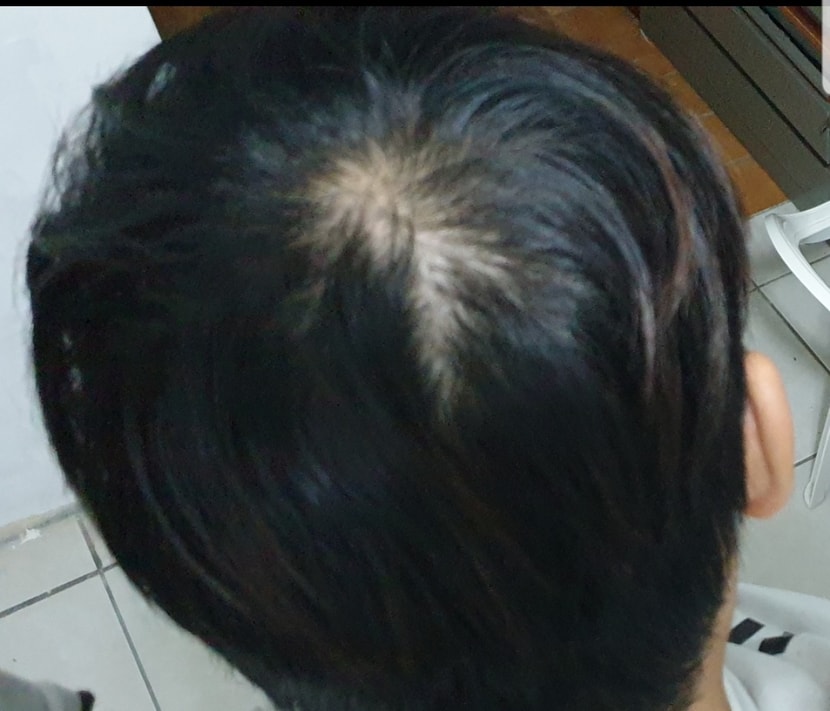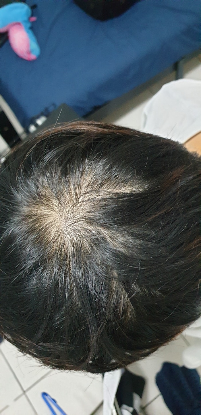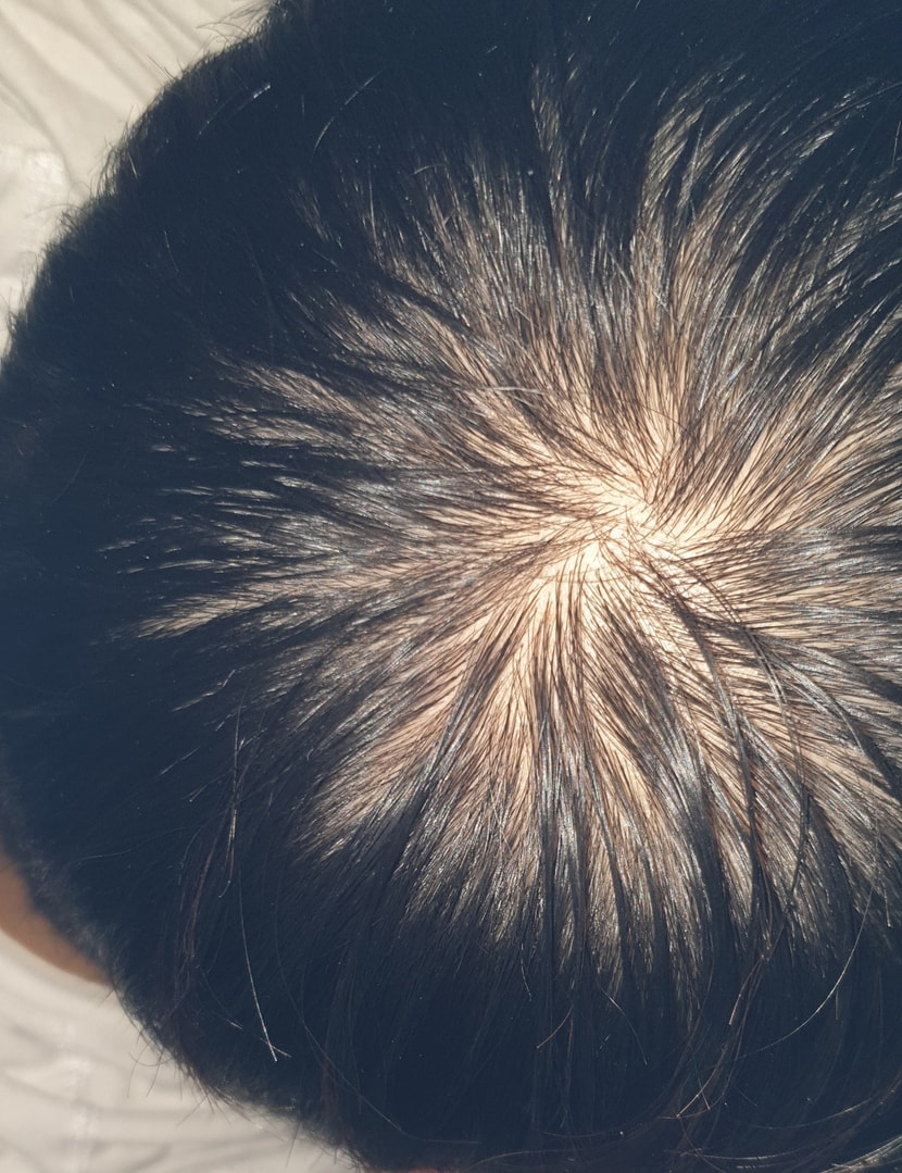 저는 아래 첫번째 사진과같이 원래 유전성 정수리탈모가 있어 머리숱이 적은 편이었습니다.