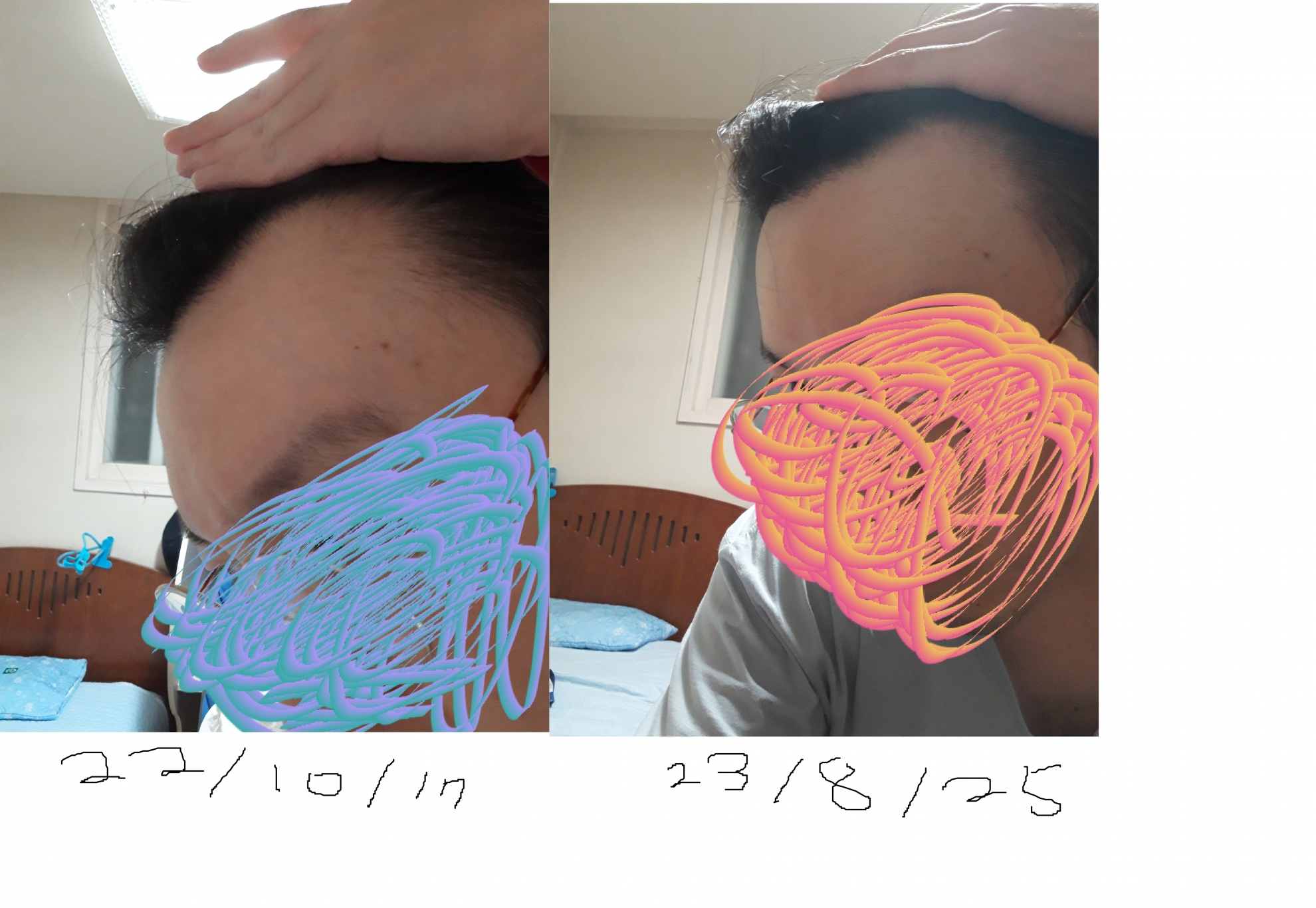 22년 10월 중순에 찍은 왼쪽, 오른쪽 M자 이마라인과 오늘인 23년 8월25일에 찍은 왼쪽, 오른쪽 M자 이마라인을 비교하려는데..