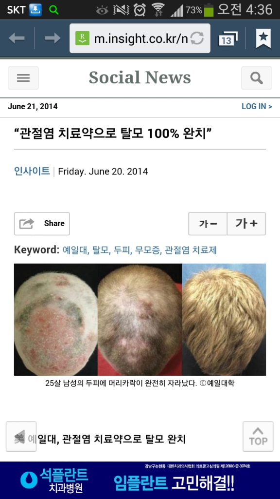 흥미로운 점은 이 남성에게 사용한 약물이 류머티스 관절염을 치료하는 약이었다는 사실이다. 연구팀은 관절염 치료제인 토파시티닙(tofacitinib)을 이 남성에게 처방했고 8개월 만에 두피와 얼굴에 다시 털이 자라나기 시작했다고 설명했다.